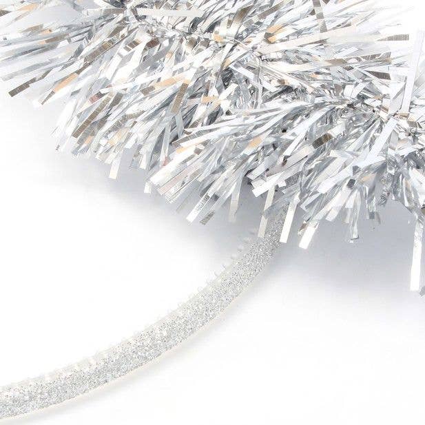 • Silver tinsel Christmas halo on a narrow glitter aliceband • Base aliceband is plastic with small teeth • Width - 5mm • Halo diameter - 13cm • 1 unit is 1 aliceband in a pp bag