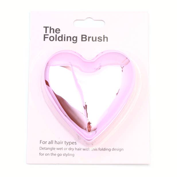 • Heart shaped pink plastic folding detangling hair brush • Black plastic pins • Mirrored inside lid • Size approx - 8cm • 1 unit is 1 brush in a clear box attached to a display card